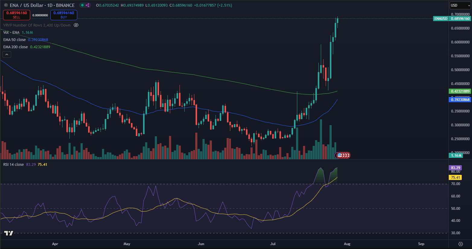 From a technical perspective, the situation is particularly interesting. The price of ENA has broken through two key technical indicators – the 50-day and 200-day EMAs. This double breakout may signal a shift into a bullish phase. Additionally, the 200-day EMA is now turning from resistance into support, increasing the chances for further growth.