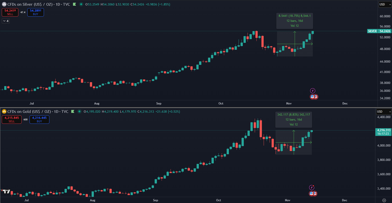 Silver over the past two weeks has experienced a significant rise of 18%, while gold gained only 8%. This sharp increase followed a short but noticeable correction that took place from October 17 to 28. After that, investors returned to precious metals as a safe haven amid growing global uncertainty.