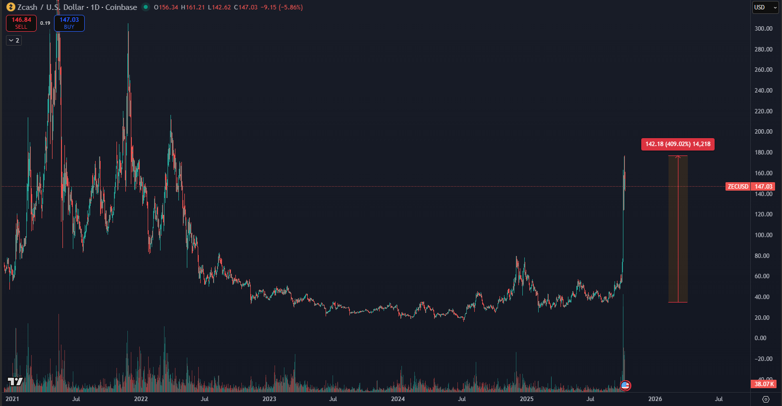 Cryptocurrency Zcash experienced an exceptional week, pushing it to a 3-year price high. As data from TradingView shows, the token’s price jumped more than 400% over 50 days, with the last two weeks accounting for nearly 300%. This turnaround comes after a long period of stagnation, which affected the project due to regulatory pressures and declining adoption.