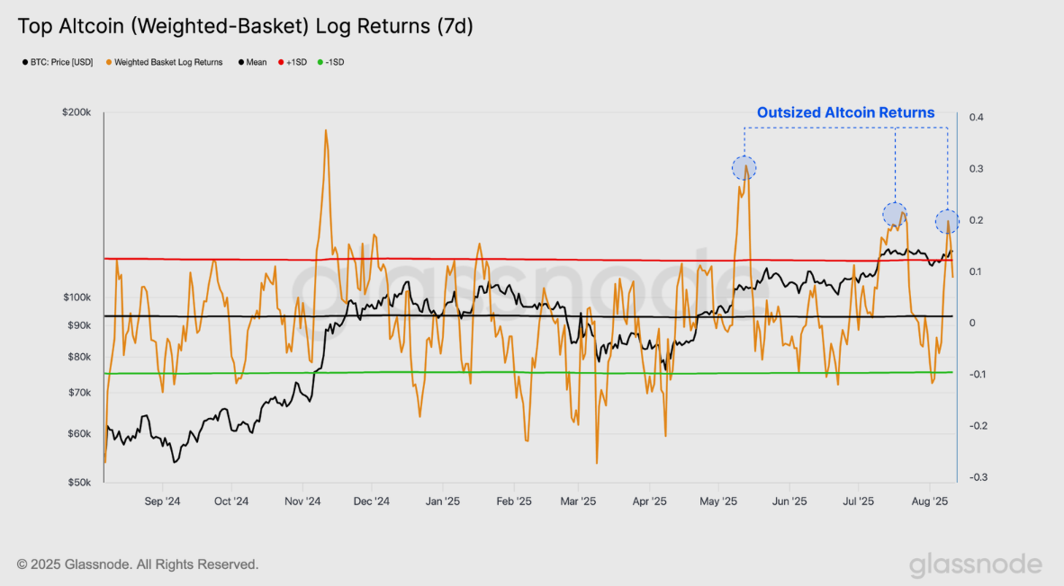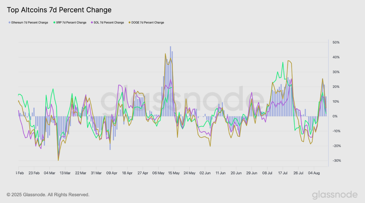 Cryptocurrencies have experienced extraordinary activity in recent weeks, as documented by Glassnode. The largest altcoins, including Ethereum, XRP, Solana, and Dogecoin, delivered remarkable gains to investors over a seven-day period. According to TradingView data, Ethereum rose by 25.5%, XRP by 16.2%, Solana by 13.6%, and Dogecoin by 25.5%. This growth occurred during July and August, primarily driven by intense speculative activity in the market.