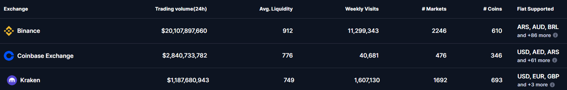 - Kraken supports around 693 cryptocurrencies and maintains strong liquidity for major coins such as Bitcoin, Ethereum, and stablecoins. The platform has built a solid reputation in regions where other exchanges face regulatory challenges, providing reliable trading options for users seeking both established and mid-cap assets. It has around 1.1 billion daily trading volume.