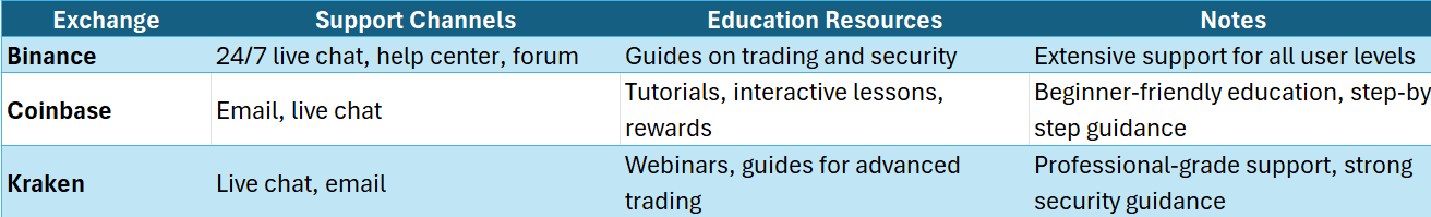 In addition to technical safeguards, customer education plays a role in security. Binance provides comprehensive guides on secure trading, recognizing phishing attempts, and protecting digital wallets. Coinbase’s educational resources are highly beginner-friendly, including interactive tutorials and alerts for unusual account activity. Kraken targets professional traders with in-depth security documentation and guidance on using third-party hardware wallets. For investors seeking the safest environment for their cryptocurrency, understanding how each platform prioritizes protection is essential.