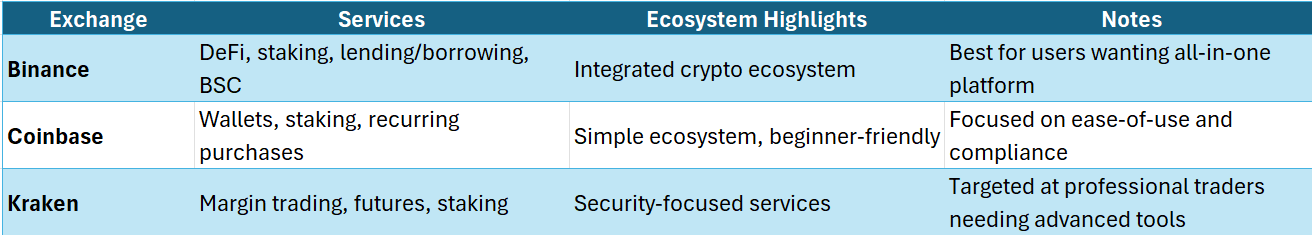 - Coinbase, in contrast, focuses on simplicity and regulatory compliance, integrating wallet services, recurring purchases, and a limited selection of staking options. While its ecosystem is smaller, it offers a secure and straightforward environment for investors looking to minimize complexity.
