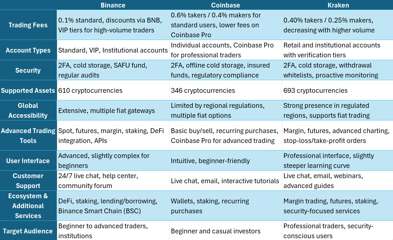 The choice between Binance, Coinbase, and Kraken often comes down to the user’s trading style, technical knowledge, and desired level of platform complexity. Binance remains the go-to choice for users seeking versatility and advanced options, while Coinbase excels in accessibility and regulatory reassurance. Kraken strikes a balance between security, advanced trading tools, and reliability, appealing to users who value both technical features and a strong track record of protection.