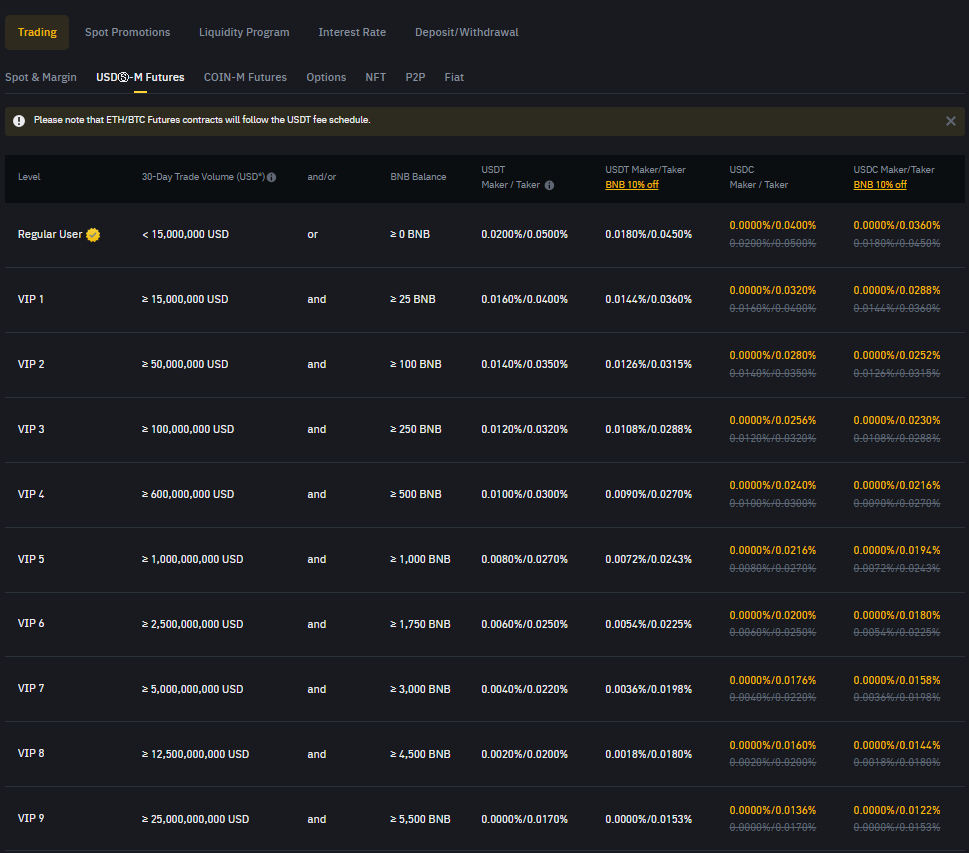 According to Binance’s official fee schedule for USD-M Futures, trading fees are tiered based on your 30-day trading volume and VIP level. For standard users, the maker fee is 0.02%, and the taker fee is 0.05%. These fees can be reduced by holding BNB and participating in the VIP program.