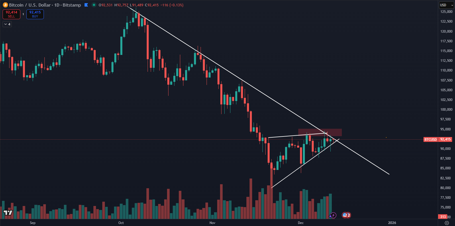 Bitcoin is trading within a gradually narrowing range and faces repeated failed attempts to break resistance around the $92,000 to $94,000 zone (red zone on the chart).