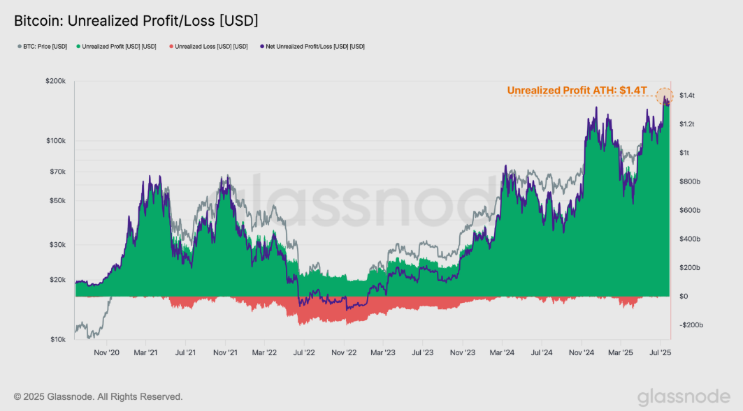 A new historical milestone has also been reached: unrealized profits across all market participants have surpassed $1.4 trillion. This figure represents the cumulative value of all unrealized profits in the network and confirms that a significant portion of the market is in profit on paper.