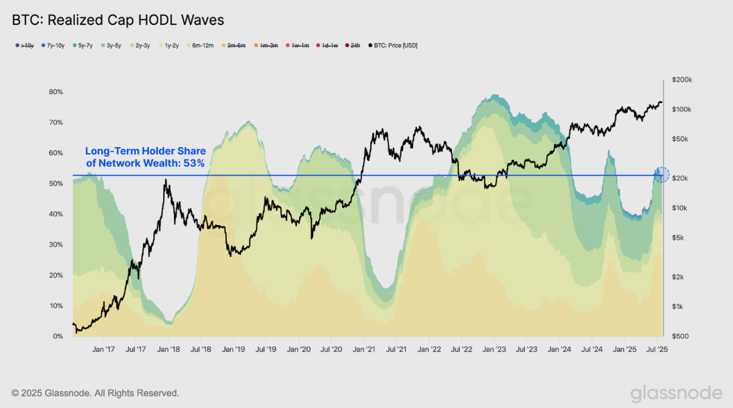 One of the most striking factors of this cycle is the strength of long-term holders. They currently own 53% of the total network wealth, despite selling off part of their holdings in previous months.