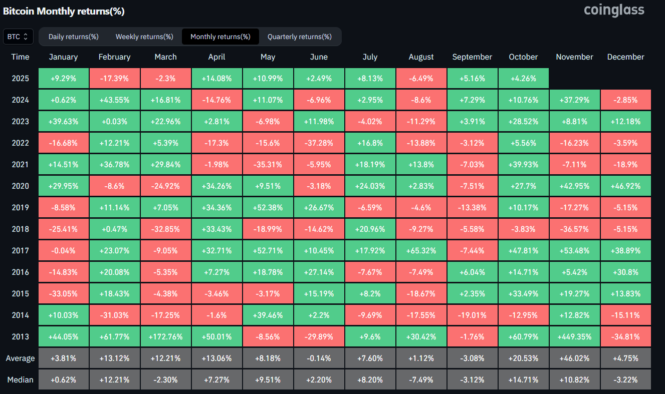 According to data from CoinGlass, Bitcoin avoided the traditionally weak performance in September, achieving a 5.16 % increase. Historically, September is the least favorable month for this cryptocurrency, with an average loss of -3.08 %. The last time September was in the red was in 2022, highlighting that the current result can be considered very solid.