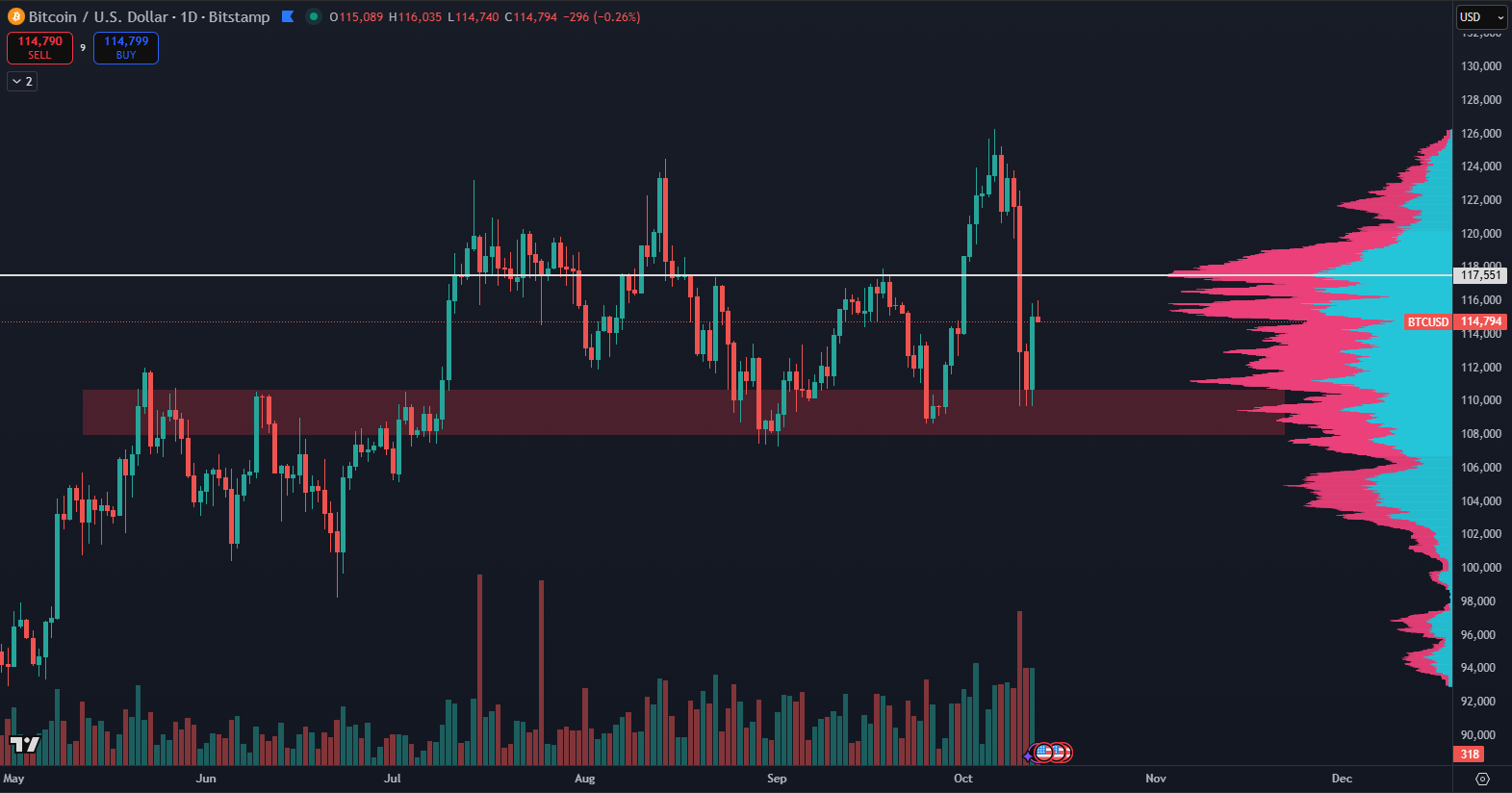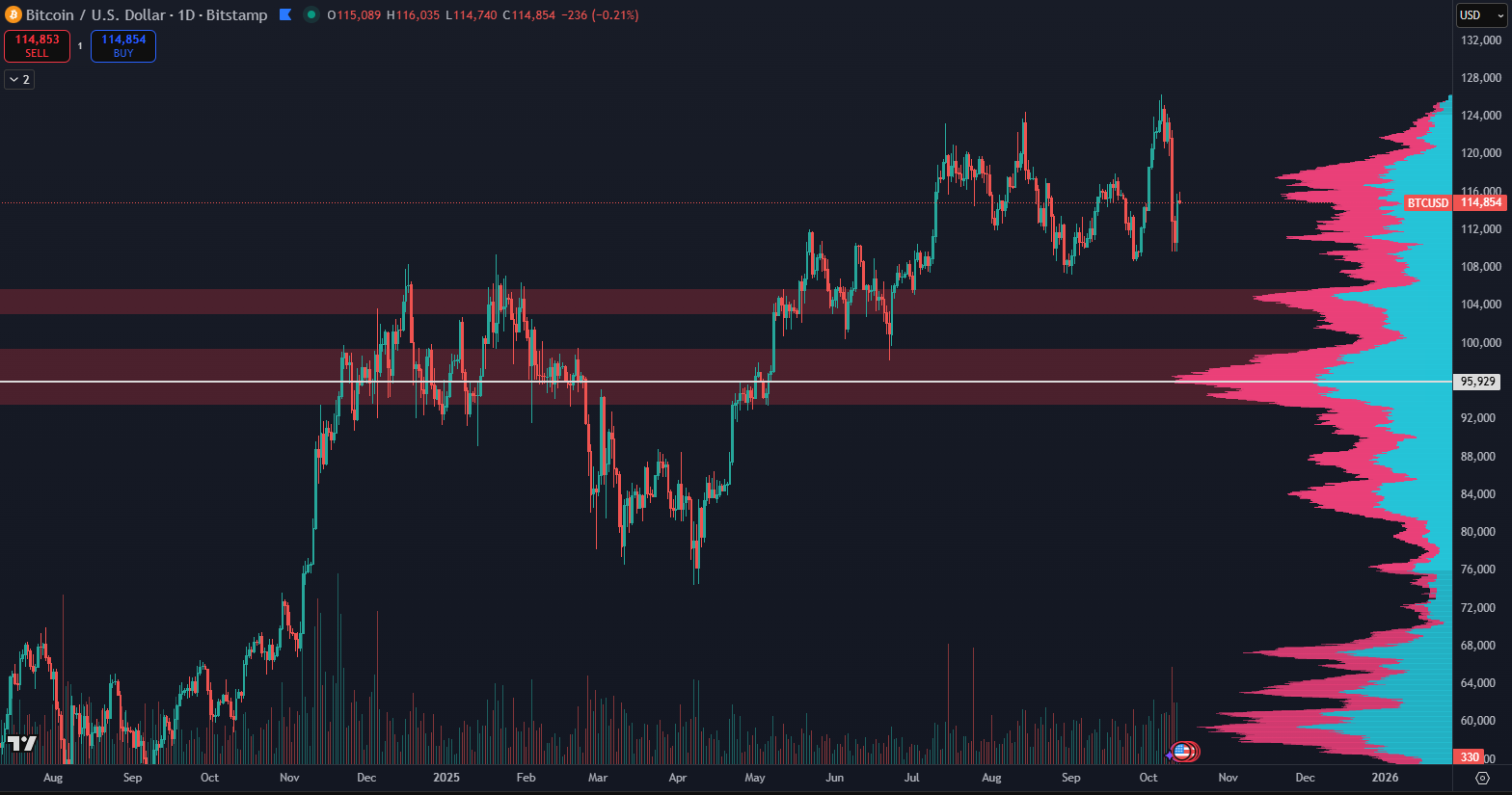 The price of Bitcoin is moving in a sideways range between its historical high and support around $109,000. The next key zones with significant investor activity are between $106,000 and $103,000 and lower in the range of $99,000 to $93,000. Historically, these areas have concentrated the largest trading volumes, making them strong support levels.