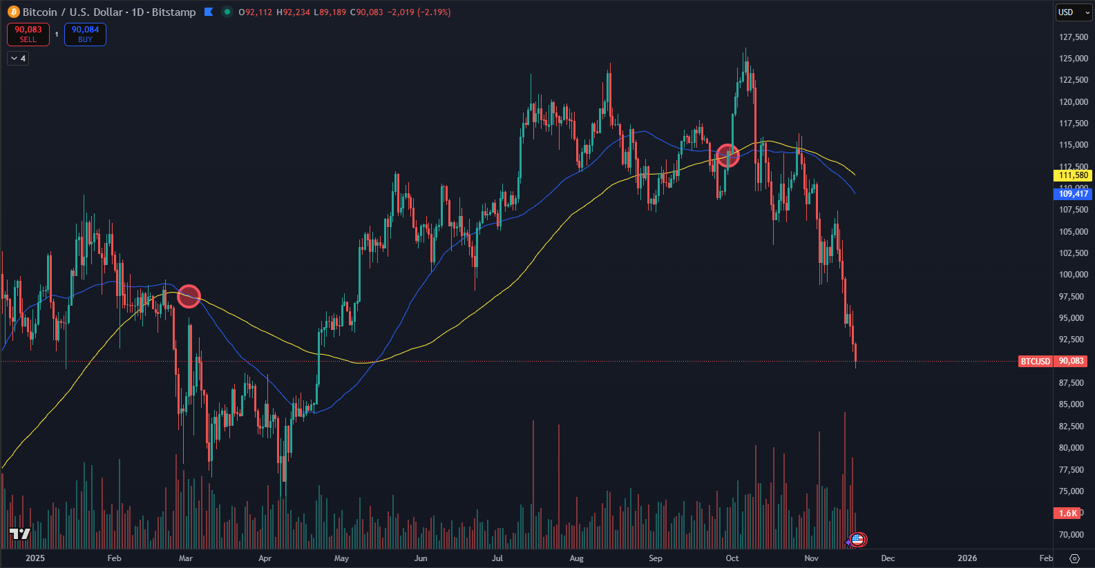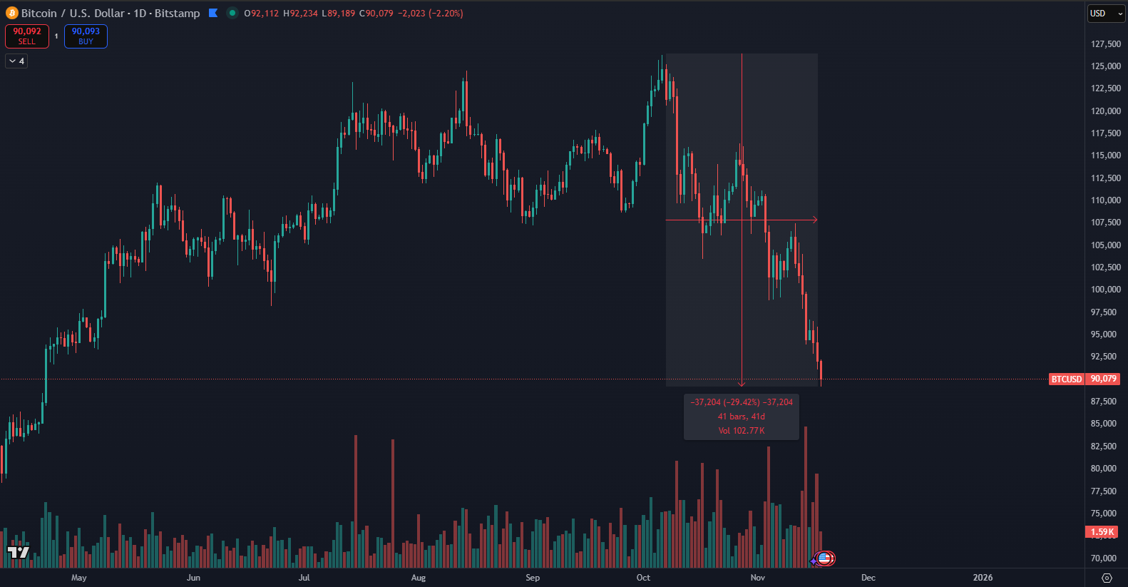 Bitcoin has sharply dropped in recent days to a level not seen by investors for more than six months. According to TradingView data, the price fell as low as $89,189. The decline happened just a few weeks after the market enjoyed historic highs around $126,000 in early October.