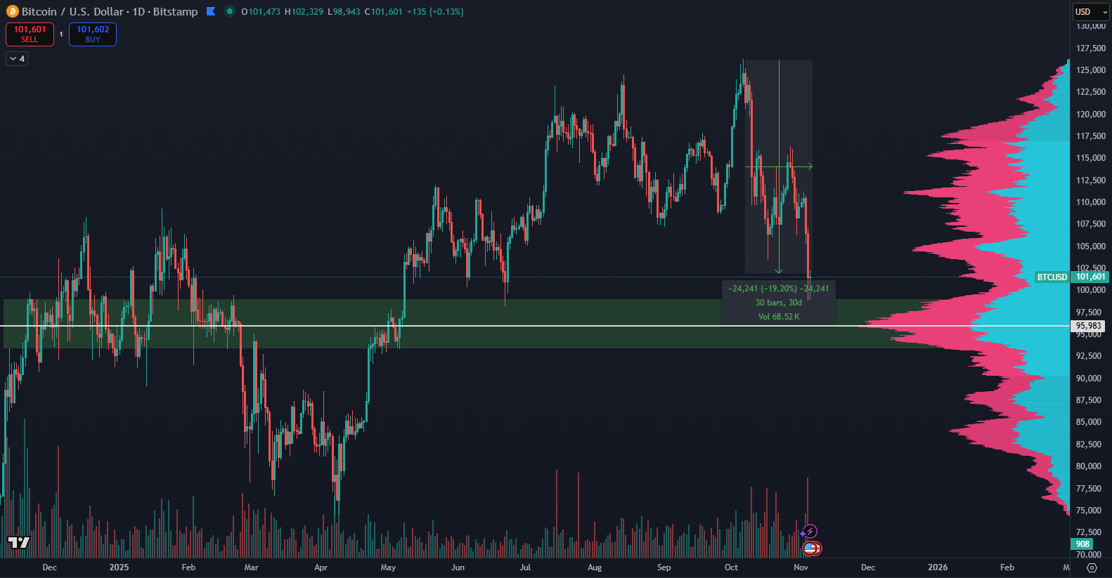 Bitcoin is entering another phase of correction and, at the time of writing, according to TradingView, is trading at approximately $101,602. After breaking through a strong support zone between $103,000 and $106,000, market attention is shifting lower into the $99,000 to $93,000 range. A new local low has already formed in this area at $98,900, which lies at the upper boundary of the current support. Increased trading volumes in this zone suggest that traders see attractive entry levels here, which could lead to temporary price stabilization.