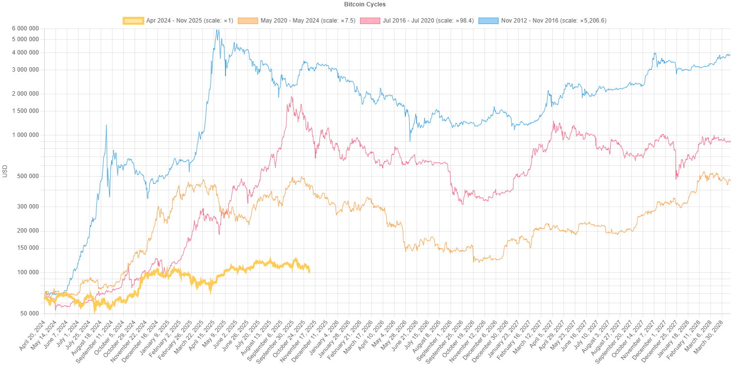 The current decline coincides with a period when Bitcoin reached its peak in previous cycles. According to data from BitcoinCyclesComparison, approximately 500 days after the halving, similar dynamics have always been observed — a sharp rise followed by a correction before the onset of a bear market. Some analysts therefore believe that the price of $126,200 may have represented the final top of this four-year cycle.