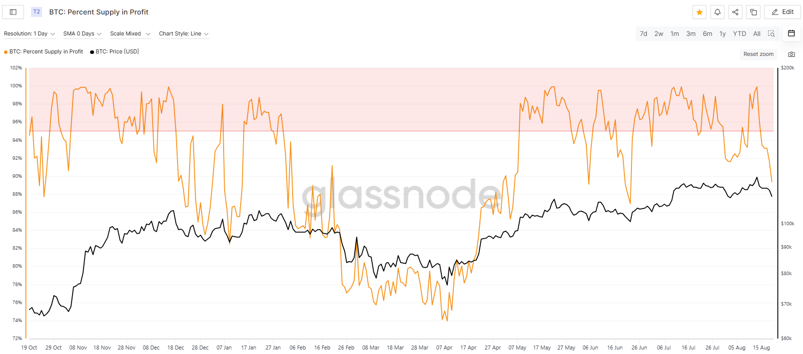 One of the key reasons is profit-taking by investors who are realizing gains after a sharp rise. According to Glassnode, the drop has caused every tenth holder to be at a loss. The in-profit supply metric fell from 100% to the current 89%. This pressure naturally leads to selling and short-term corrections, which can shift market sentiment.
