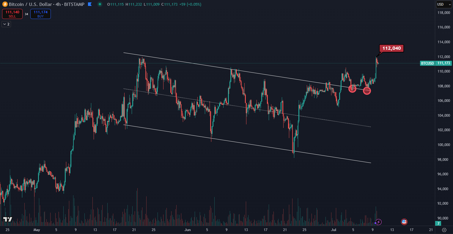 On Wednesday afternoon, Bitcoin surged to a new all-time high of $112,040, surpassing the previous record from May, according to data from TradingView. This time, the sharp rise was not driven by ETF funds, but by major tech companies and direct Bitcoin purchases by public companies.