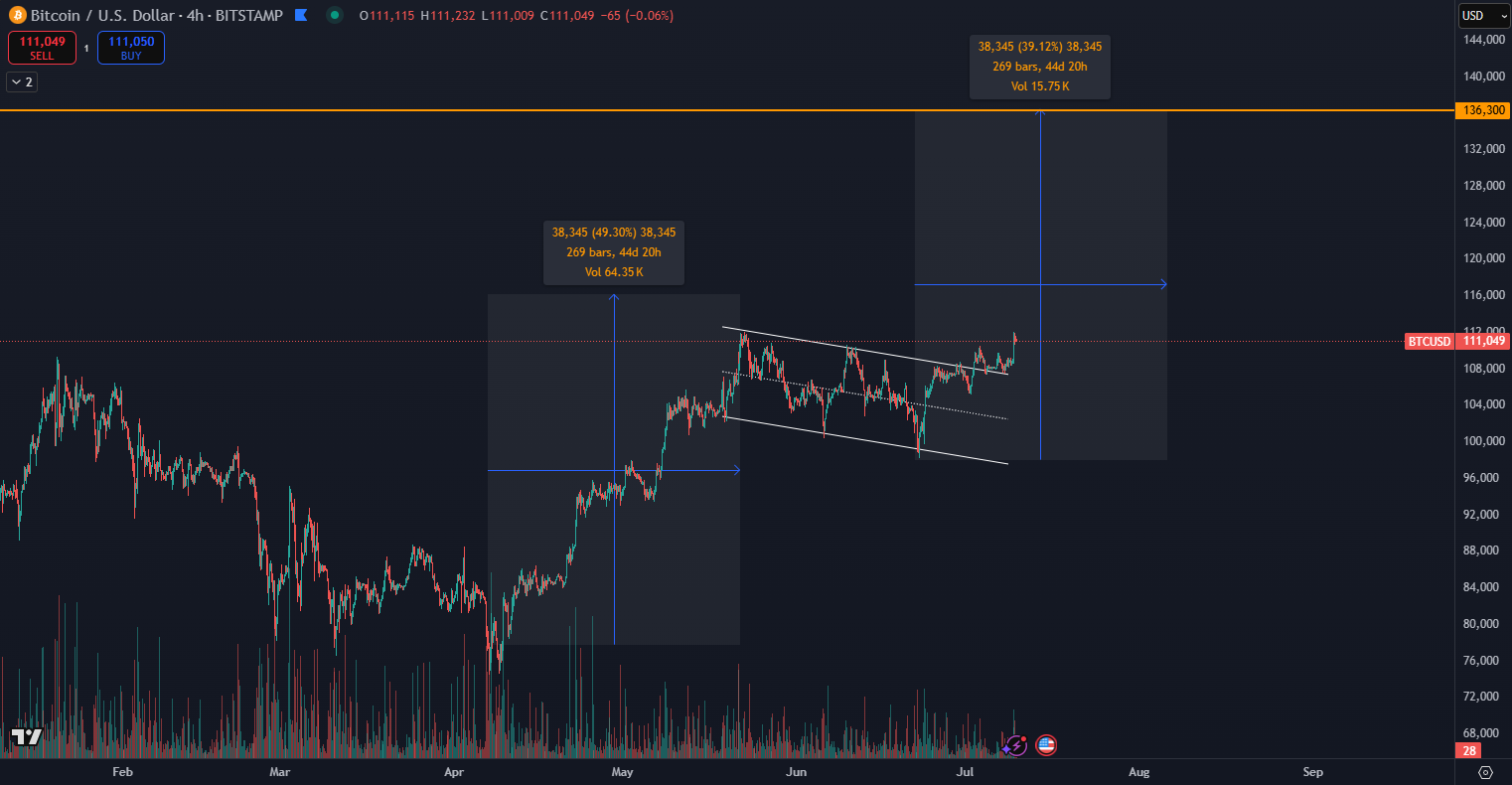 With this move, Bitcoin ended a months-long pattern known as a falling flag, a formation that often precedes the continuation of an upward trend. After closing this structure, the usual growth mirrors the previous impulse – which could push the price up to $135,000.