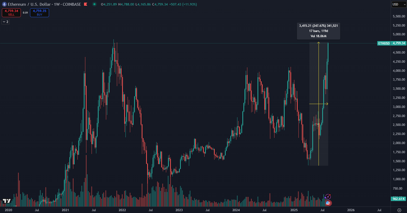 Ethereum has recorded significant growth, as its price rose by 250% over the past 120 days to $4,788, reaching the highest level since November 2021, according to TradingView data. The growth was supported by several factors, including expectations of a US Federal Reserve interest rate cut following the release of the latest CPI data, reported CoinDesk.