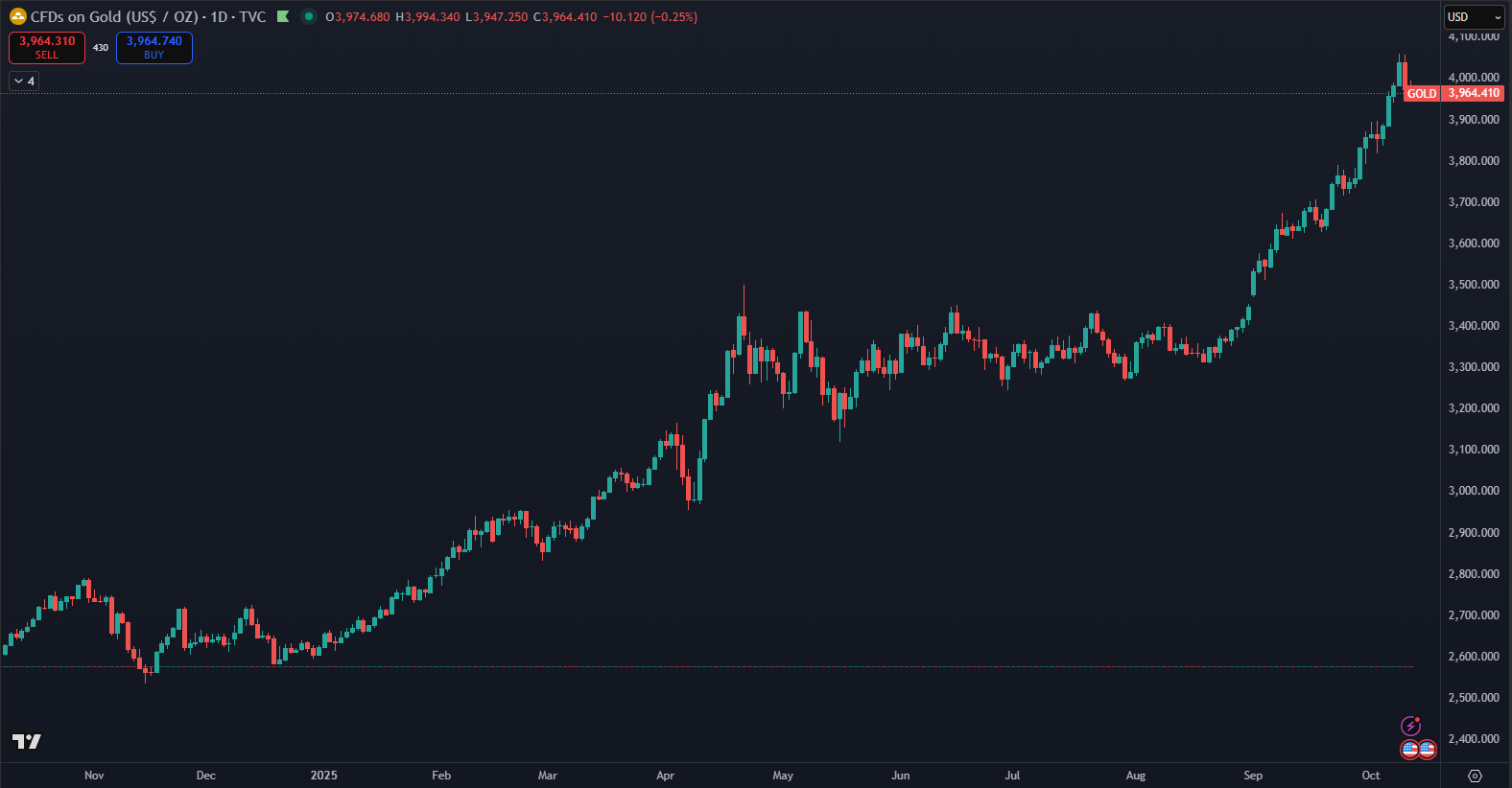 Gold recently surpassed a historical record of $4,056 per ounce. This came after an exponential rise over the past 50 days, during which the commodity’s price increased by 23%. Year-over-year, precious metal has risen by 56% according to TradingView data, and over the past five years, it has gained up to 113%.