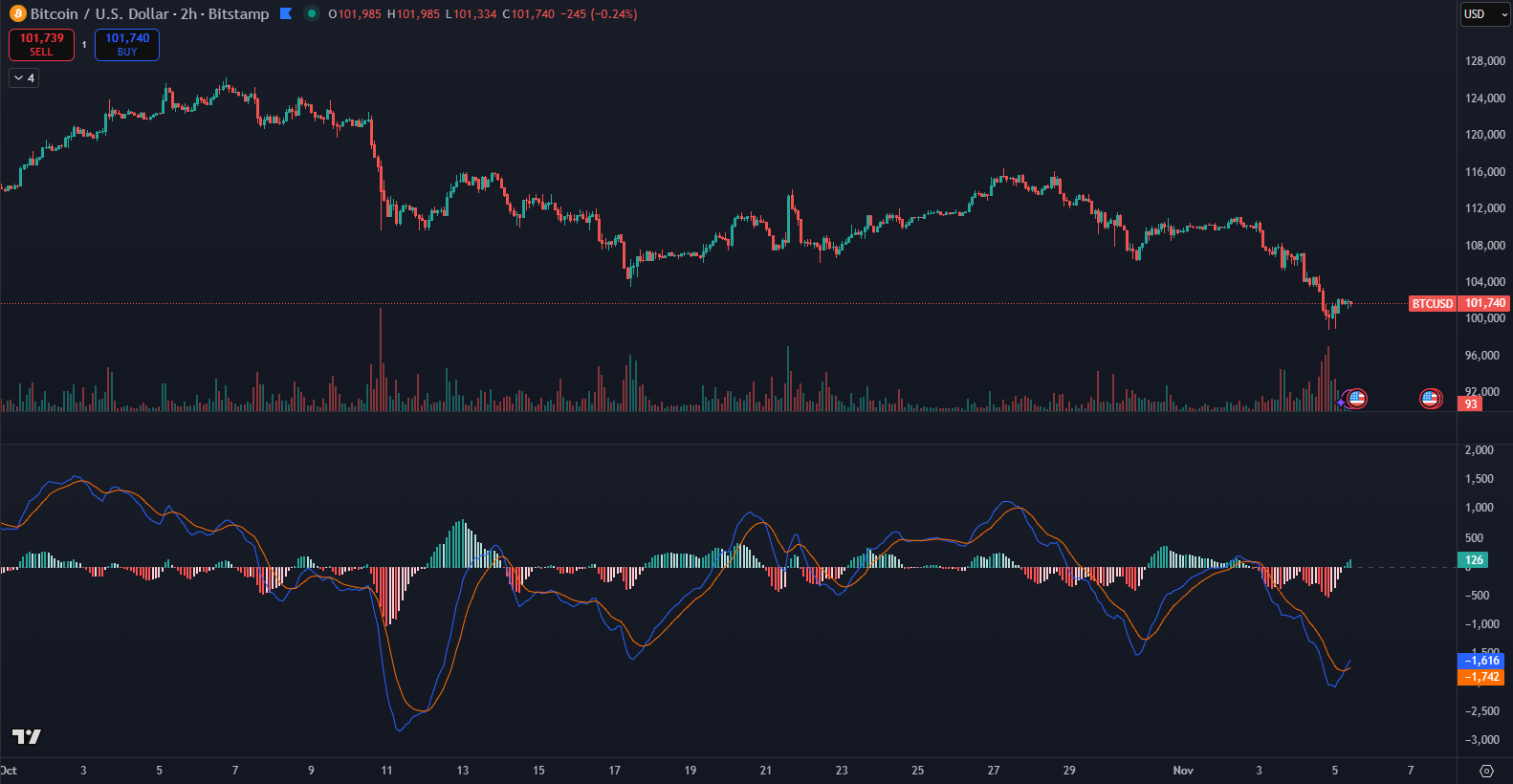 - MACD (Moving Average Convergence Divergence): Consists of two moving averages and a histogram showing momentum changes. When the MACD line crosses above the signal line, it’s a bullish signal; when it crosses below, it’s bearish. The histogram’s direction and spacing help assess trend strength.