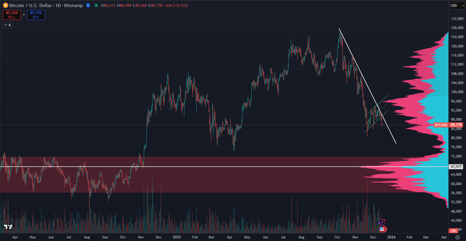 Bitcoin continues to react to technical levels with high precision. After the price was rejected at the 94,000-dollar resistance, sellers took control. The market confirmed that the correction is not a short-term fluctuation but rather a systematic cooldown. From a volume perspective, the most significant support area appears to be the price range from 72,000 to 56,000 dollars.