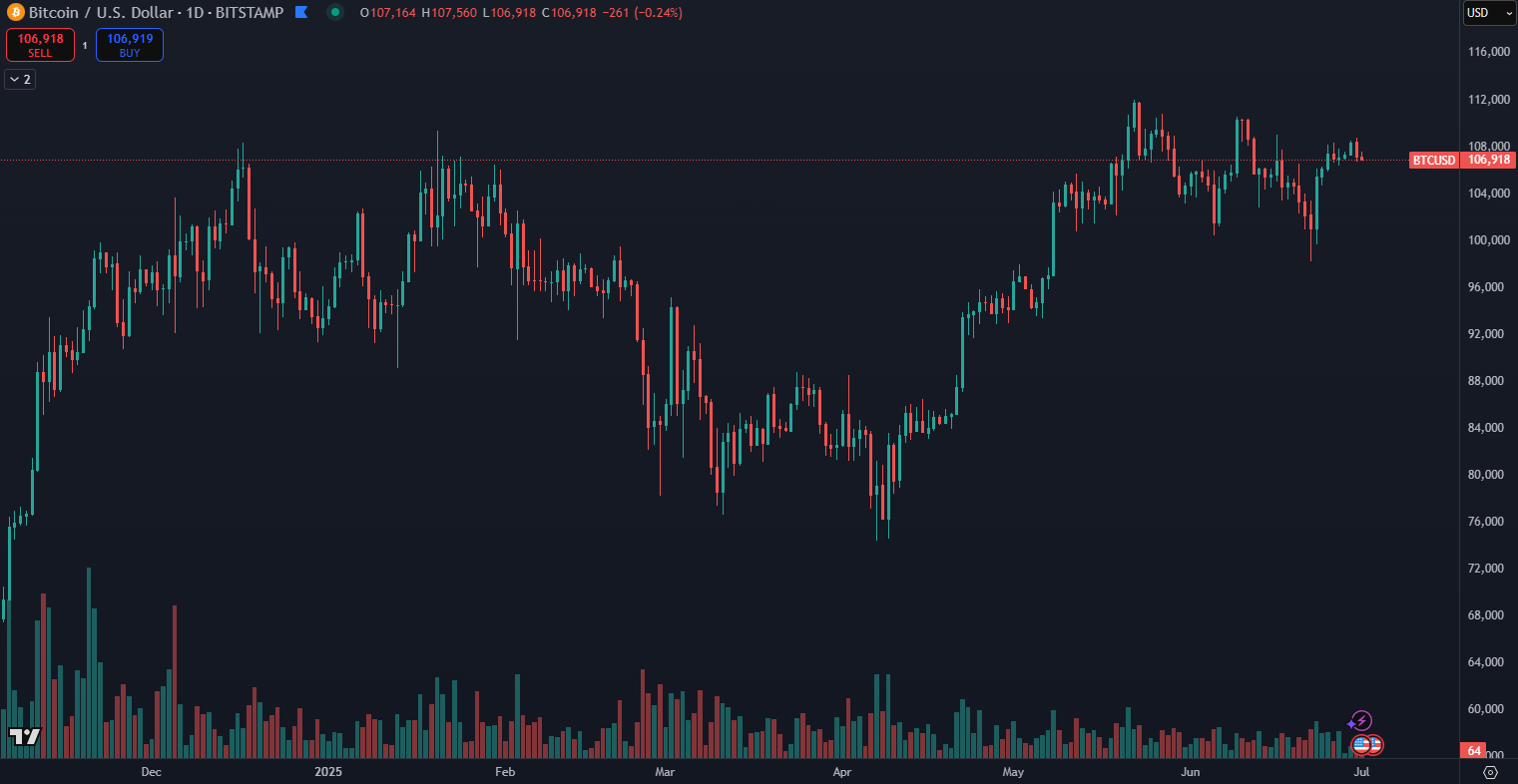 Although Bitcoin is in a slight uptrend – currently around 106,800 dollars with a 24-hour drop of -0.33% – it remains, according to TradingView, in a consolidation phase between 100,000 and 110,000 dollars. According to Glassnode, on-chain activity and holder profitability have decreased in recent weeks, which is typical during periods of low volatility and market hesitation.