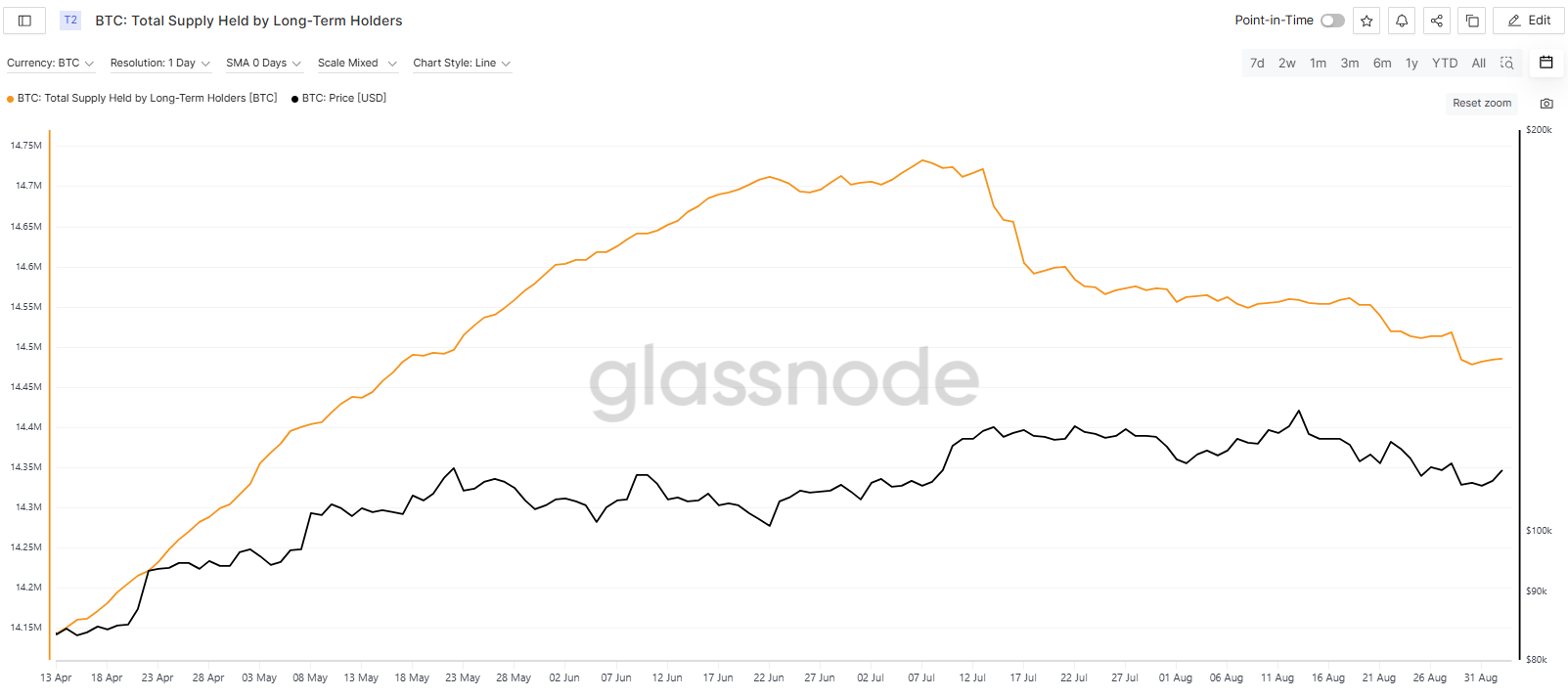As a result, according to Glassnode data, long-term holdings have been decreasing since early July. From a previous high of 14.73 million coins, the volume dropped to 14.48 million. This means long-term investors have sold approximately 250,000 BTC in just two months, creating market pressure. For reference, the total supply of coins is currently around 19.91 million.