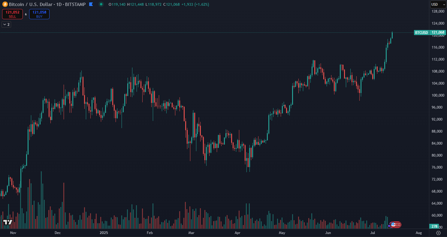 Bitcoin has experienced a dramatic surge and for the first time in history surpassed the $120,000 mark, according to data from TradingView. This is a market reaction to several key events, including legislative changes and public statements from prominent figures such as Donald Trump.