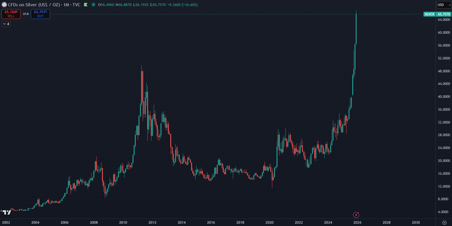 According to data from the analytical platform TradingView, the price of silver reached a new all-time high at 65.75 dollars. This precious metal has experienced the most dynamic growth in its history. Over the past more than 2,000 days, its value has increased by an incredible 460%, confirming a strong long-term trend and growing investor interest in real assets during periods of monetary uncertainty.