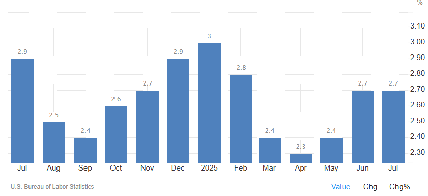 Expectations for Fed rate cuts are supported by July inflation at 2.7%, below the anticipated 2.8%, according to TradingEconomics. Lower rates could stimulate investments and make it easier for households and businesses to access credit. Former President Donald Trump has repeatedly pushed the Fed to act faster, although the central bank remains cautious due to potential inflationary risks linked to tariffs.