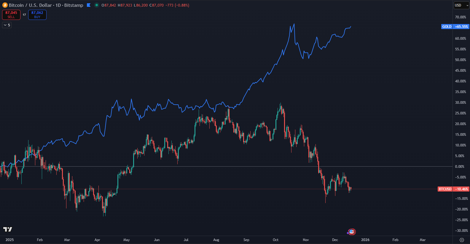 Bitcoin and gold are currently showing a significant divergence that attracts investors’ attention. According to a report by BeInCrypto, gold is trading at 4,322 dollars per ounce, just below the October record of 4,381 dollars. This rise reflects a broader trend of seeking safety amid uncertainty surrounding monetary policy and inflation. Investors expect further interest rate cuts as early as January, which increases gold’s attractiveness.