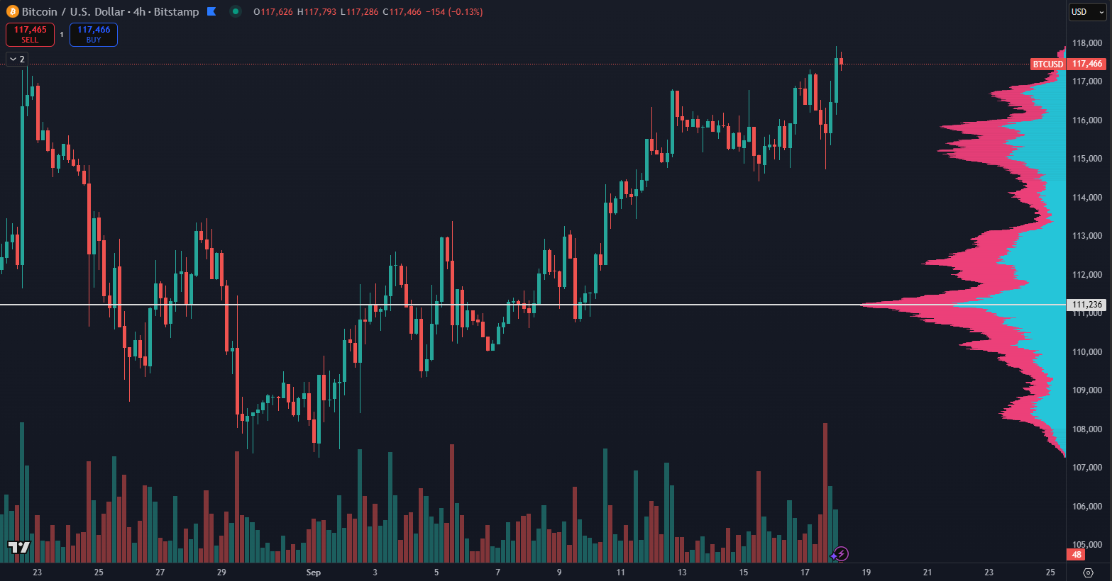 After the announcement, the price briefly approached the $118,000 mark, but it currently trades at $117,466 according to TradingView. Despite the muted reaction to the FED’s decision, Bitcoin continues its positive trend, having gained 9.50% since the beginning of September, indicating that the market still views the cryptocurrency favorably.