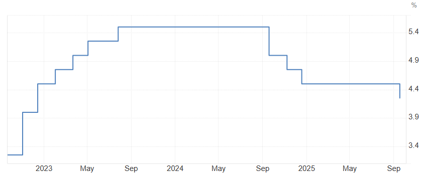In September 2025, according to Trading Economics, the Federal Reserve cut rates by 25 basis points to 4.00% – 4.25%. Governor Stephen Miran voted for a larger half-point cut. The FED expects further reductions by the end of 2025, higher GDP growth, and slightly higher inflation in 2026.