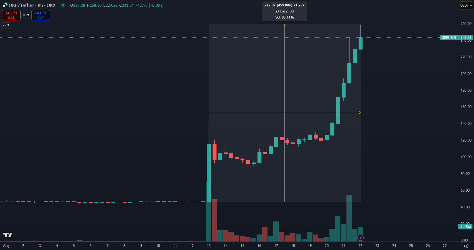 According to TradingView, OKB’s price rose by 460% in 9 days, becoming the most profitable cryptocurrency in the top 100 rankings. This growth underscores the strength of the deflationary model and the successful migration to the X Layer blockchain, which enhances its usability and demand among investors.