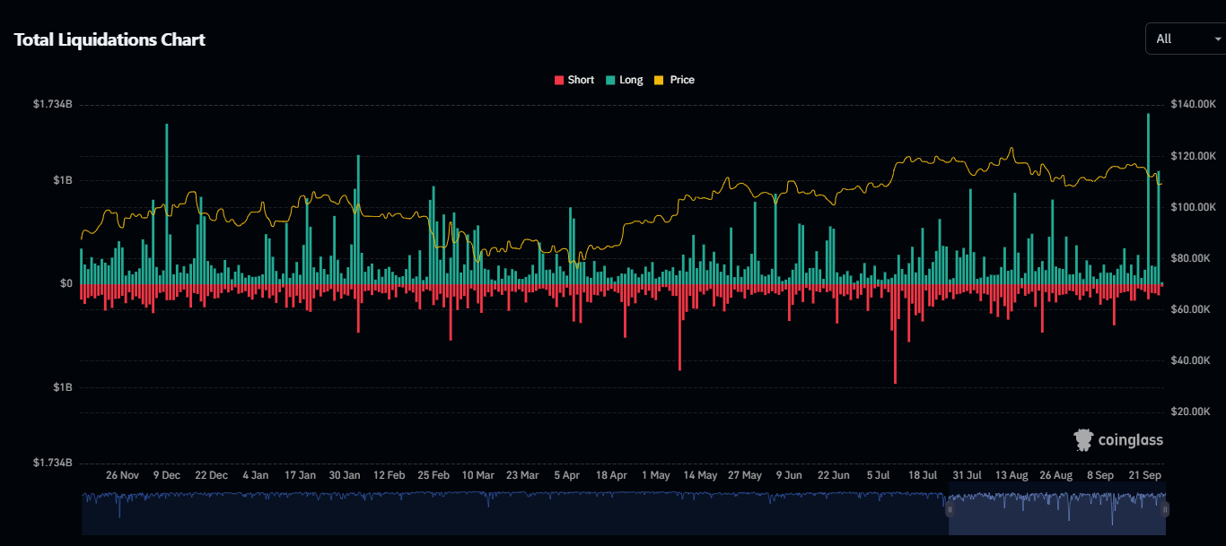 According to CoinGlass, on September 25 massive long position liquidations occurred in the amount of 1.09 billion dollars. Just three days earlier, on September 22, positions worth 1.65 billion dollars were liquidated.