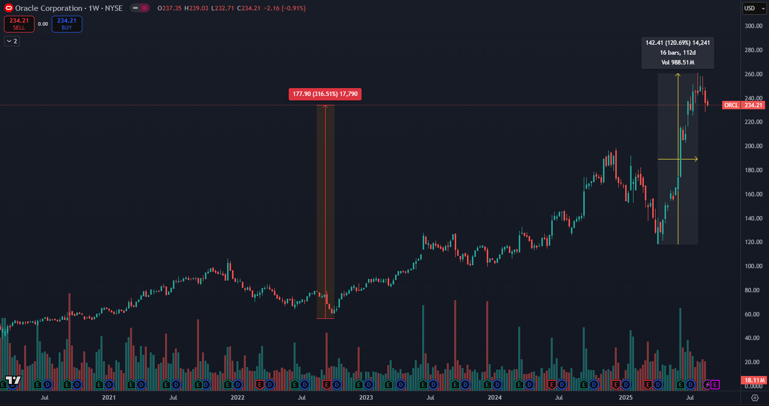 Oracle Corporation, a major US technology company listed on the NYSE, became one of the most talked-about names on Wall Street in 2025. From the beginning of April to the end of July, its stock price rose from $118 to $260, representing an astonishing increase of 120% in less than four months. The peak was reached on July 31, 2025, followed by a slight cooling to the current $234.
