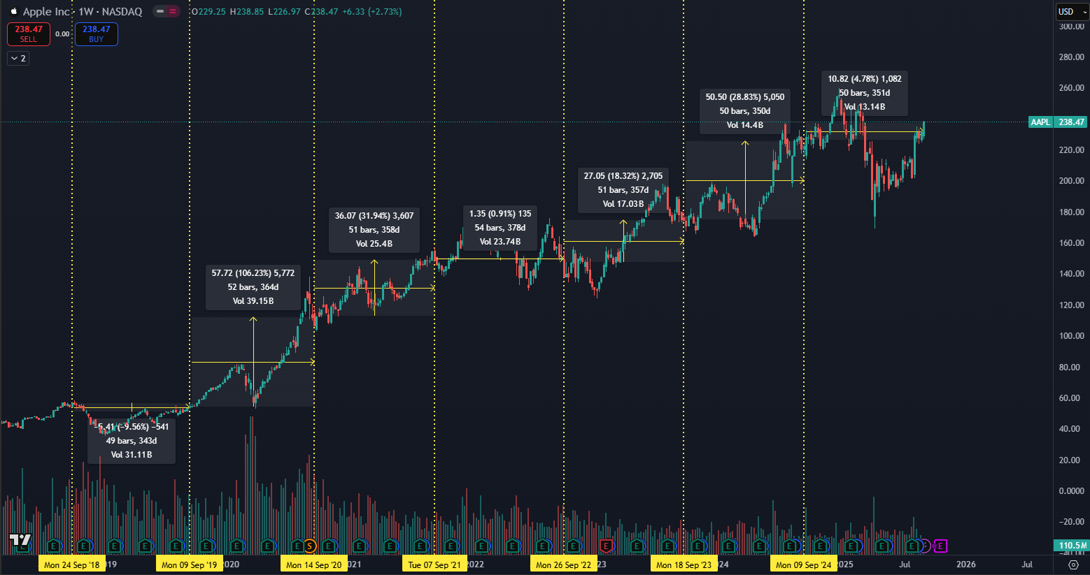 It is important to highlight that since September 2019, Apple has never experienced a negative year-over-year period. This means that even though growth dynamics fluctuated, the stock maintained a stable upward trajectory. For investors, this is a clear signal of the company’s resilience and ability to generate value even in challenging times.