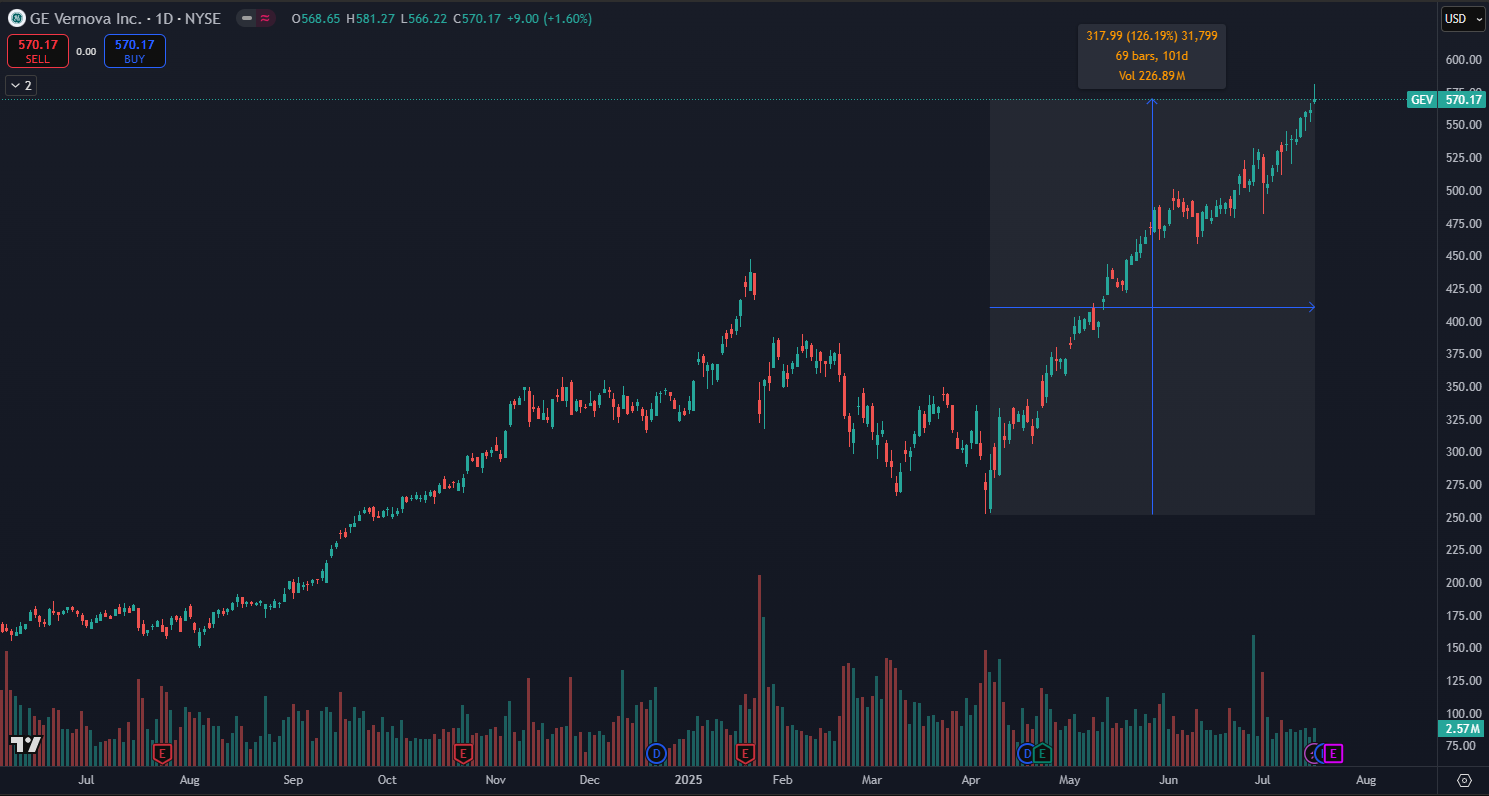 Shares of GE Vernova Inc. (GEV), which separated from General Electric in April 2024, are currently among the most profitable on the market. According to data from TradingView, they have increased by 125% over the last 100 days. Within the S&P 500 index, with a return of 73.34% for the year 2025, they rank just behind Palantir, making them the second most profitable stock, as shown in the Slickcharts ranking.