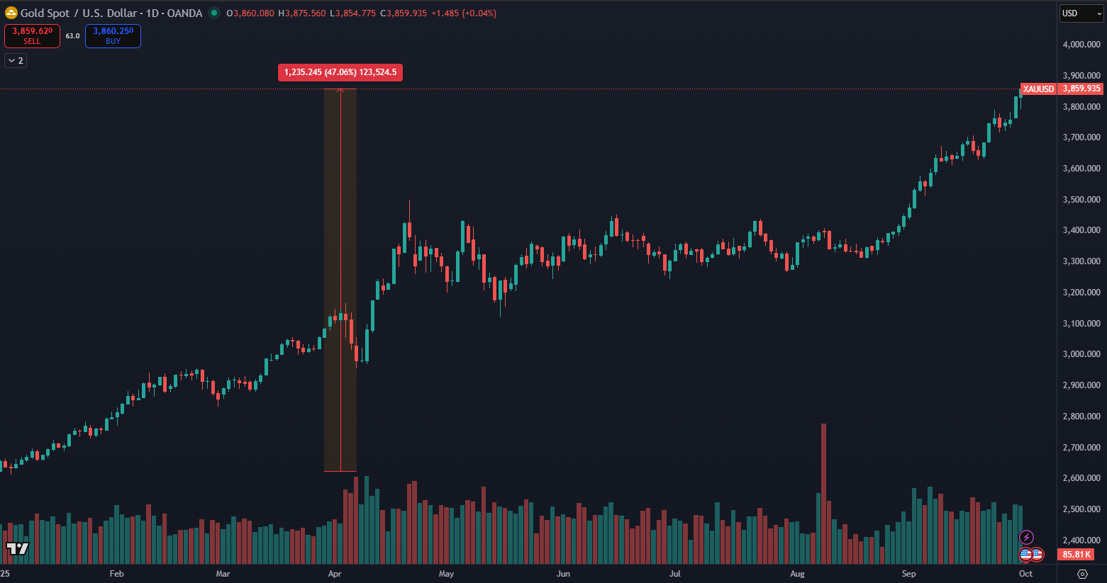 Gold is currently benefiting from a favorable environment, as investors worry about rising budget deficits and unsustainable government management in the USA. As data from TradingView shows, the metal’s price has already risen by more than 47% in 2025 and is trading around $3,858. Market expectations focus on whether it can surpass the $4,000 mark, especially if a US government shutdown occurs.