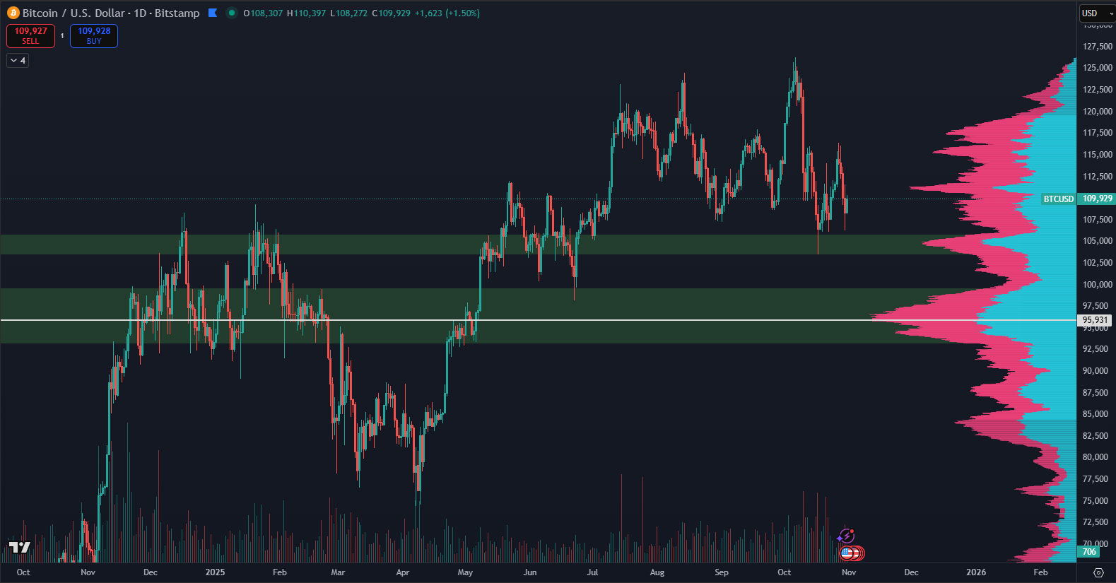 Bitcoin is currently trading around $110,000, according to data from TradingView. The price remains below the all-time high of $126,200 reached in the first week of October. Since then, the market has been undergoing a correction that has lasted almost an entire month.